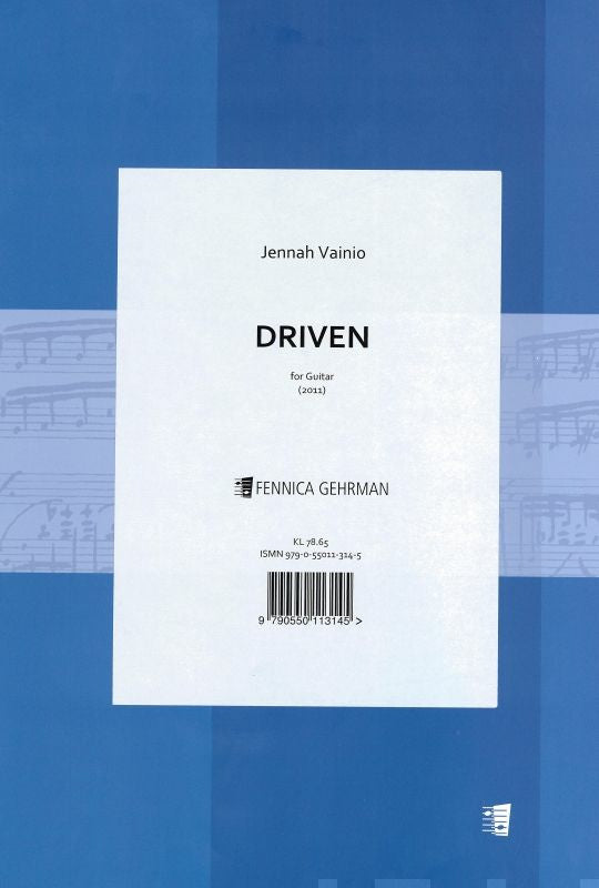 Driven for guitar is commissioned by and dedicated to guitar virtuoso Otto Tolonen. The background of the work goes to Jennah Vainio's past as a heavy metal guitarist. Tolonen asked Vainio to write something for him using metal music aesthetics as a basis. The work incorporates heavy riffs in a c... Lue lisää