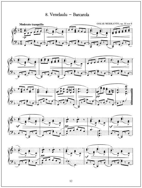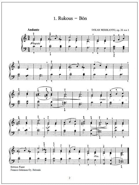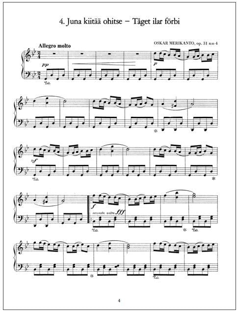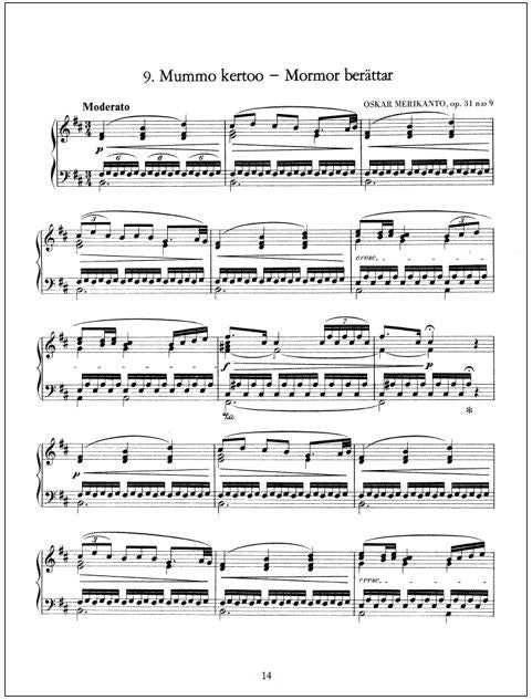This opus includes 10 small piano pieces which are well suited for instruction. The most popular is probably the Lullaby (Kehtolaulu) which has been included in many other collections and piano tutors.