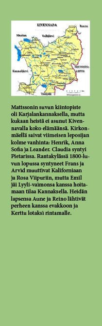 Henrik, Leander, Frans, Arvid, Emil, Anna Sofia, Claudia, Rosa ja Lyyli ovat kertoneet elämänvaiheistaan tarinoita, joista Aune, Kerttu ja Reino sekä lapset ja lastenlapset ovat kirjoittaneet muistikuvia.
