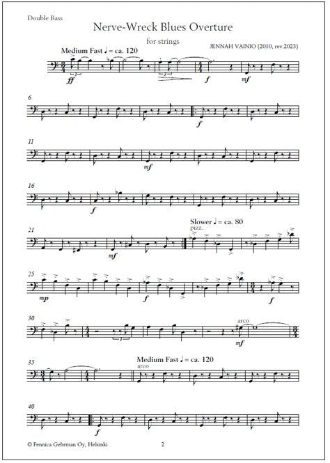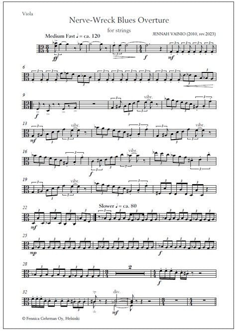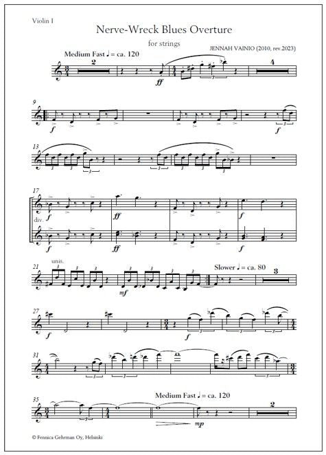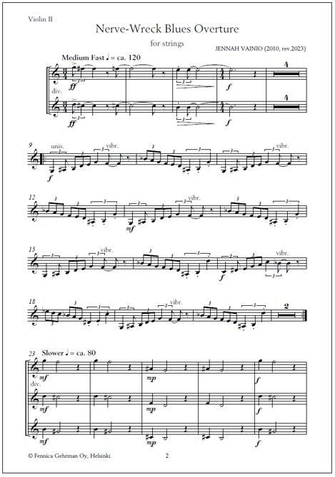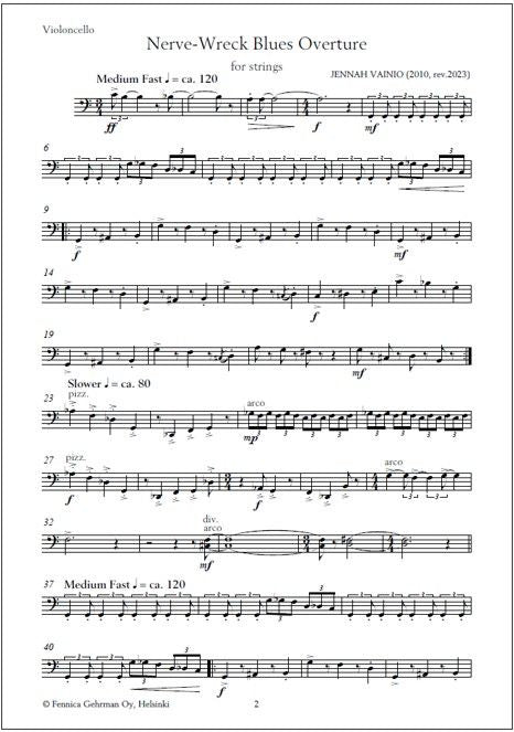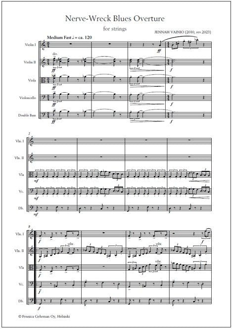 Jennah Vainio's (b. 1972) Nerve-Wreck Blues Overture (2010, rev, 2023) is a fast-paced and engaging blues overture written for string orchestra. It respects the traditions of the blues while sparingly combining the stylistic means of newer concert music.