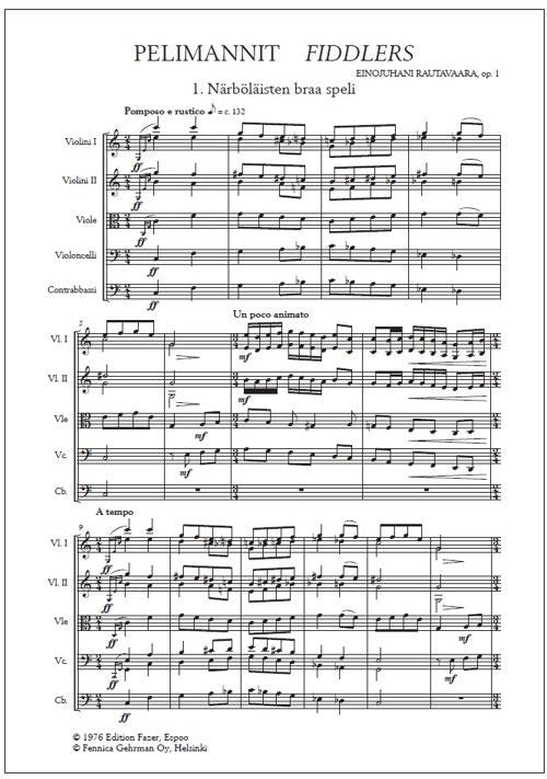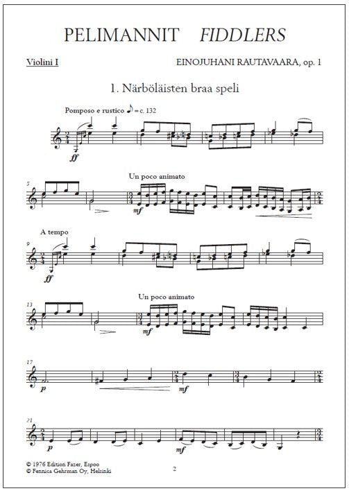 The Pelimannit (Fiddlers, 1952) suite, numbered opus 1, was the first “real” composition by Einojuhani Rautavaara (1928-2016), written even before he was accepted by the Sibelius Academy to study composition. He originally scored it for the piano, but later made an arrangement for string orchestra. Before taking the Academy's entrance exam, he had been reading about the ancient church modes in The History of Music by Heikki Klemetti, and the examples quoted by Klemetti were Ostrobothnian melodies. Their boisterous, primitive, archaic quality made a strong impression on Rautavaara, whose background lay deep in the Ostrobothnia of his forefathers.