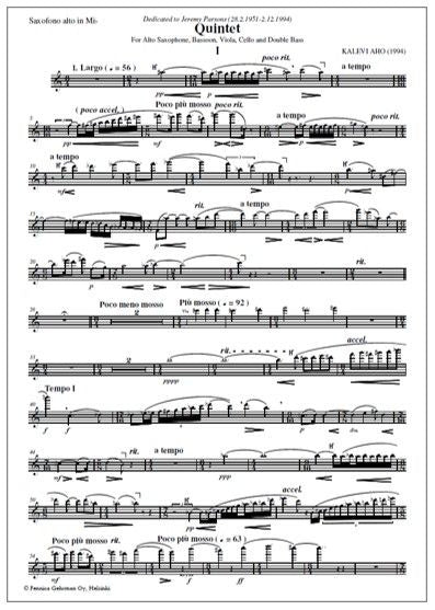 Kalevi Aho (b. 1949) composed Quintet for alto saxophone, bassoon, viola, cello and double bass in 1994. According to Gramophone (Guy S. Rickards) this is a substantial modern chamber work with meaty parts for the bassoon in an idiom which ought not to alienate audiences.