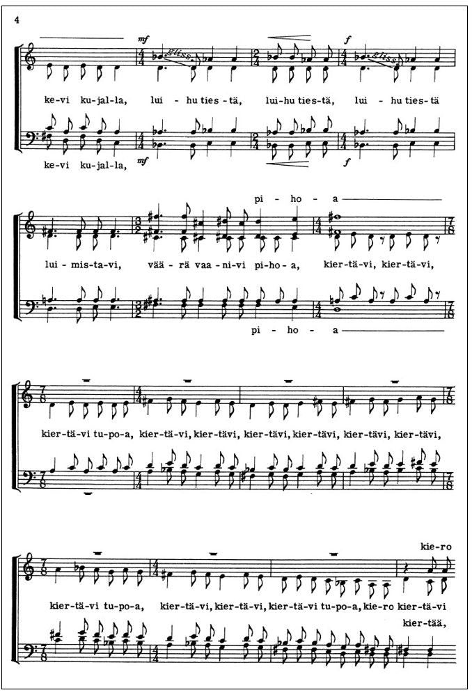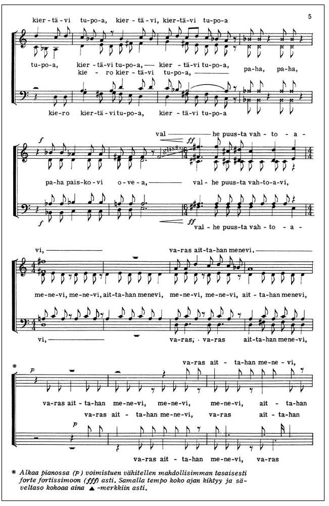 Rikasmies ja aarreaitta (The Rich Man and the Treasury, 1975) was commissioned by the Jyväskylä Studio Choir. The text by Einari Vuorela describes a rich man who suspects that a burglar is going to steal his treasures. When he finally rushes out in rage, he finds a little mouse scampering in his ... Lue lisää