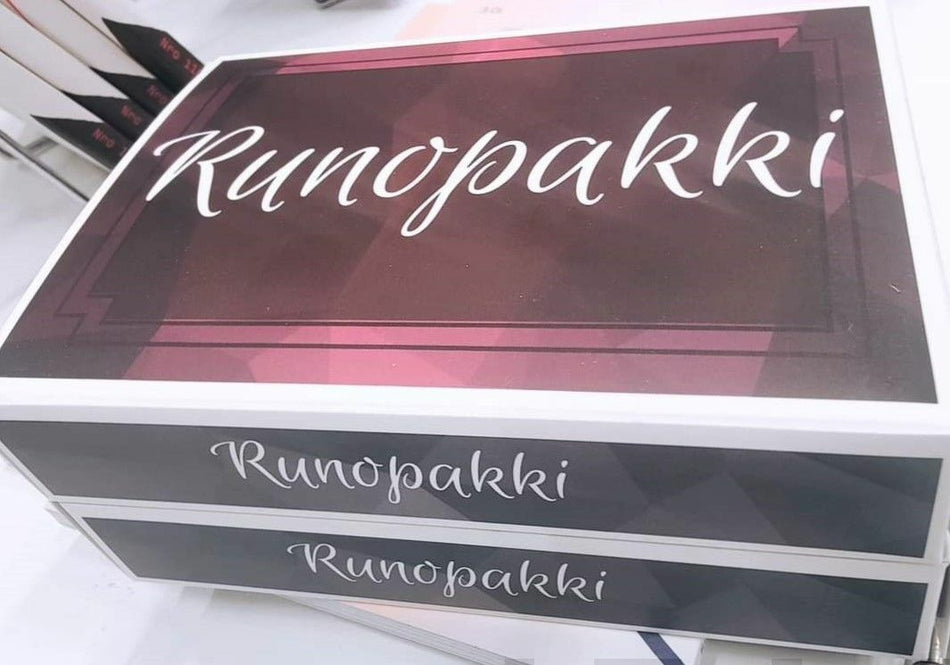 Suomessa painetun pakin kortit ovat laadukasta materiaalia ja tehty kestämään käyttöä. Runopakki houkuttelee tarttumaan kynään ja leikkimään kielellä!