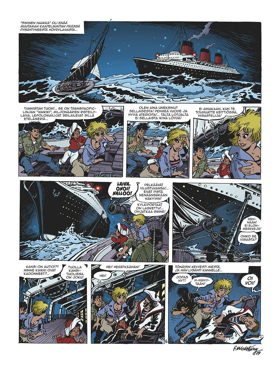 Natasha jatkaa isoäidin päiväkirjojen tutkimista. Tällä kertaa "Sinisen haukan" miehistö päätyy varsinaiselle aavelaivalle: valtamerihöyry Waikikin matkustajat ja miehistö makaavat kaikki tajuttomina. Mistä oikein on kyse? Walthéryn kuvittama upouusi Natasha-albumi julkaistaan tuoreeltaan myös su... Lue lisää