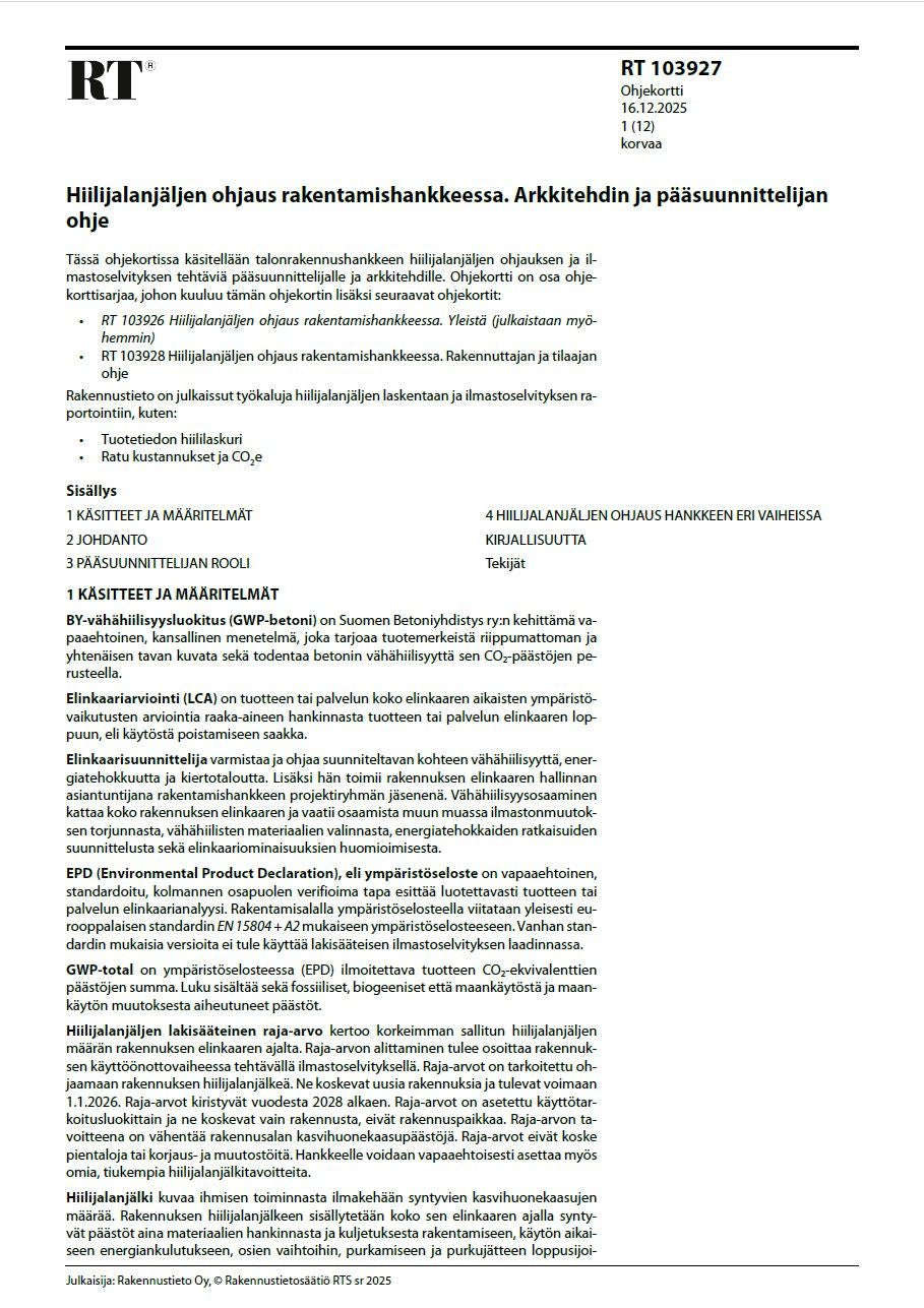 RT 103927, Hiilijalanjäljen ohjaus rakentamishankkeessa. Arkkitehdin ja pääsuunnittelijan ohje
