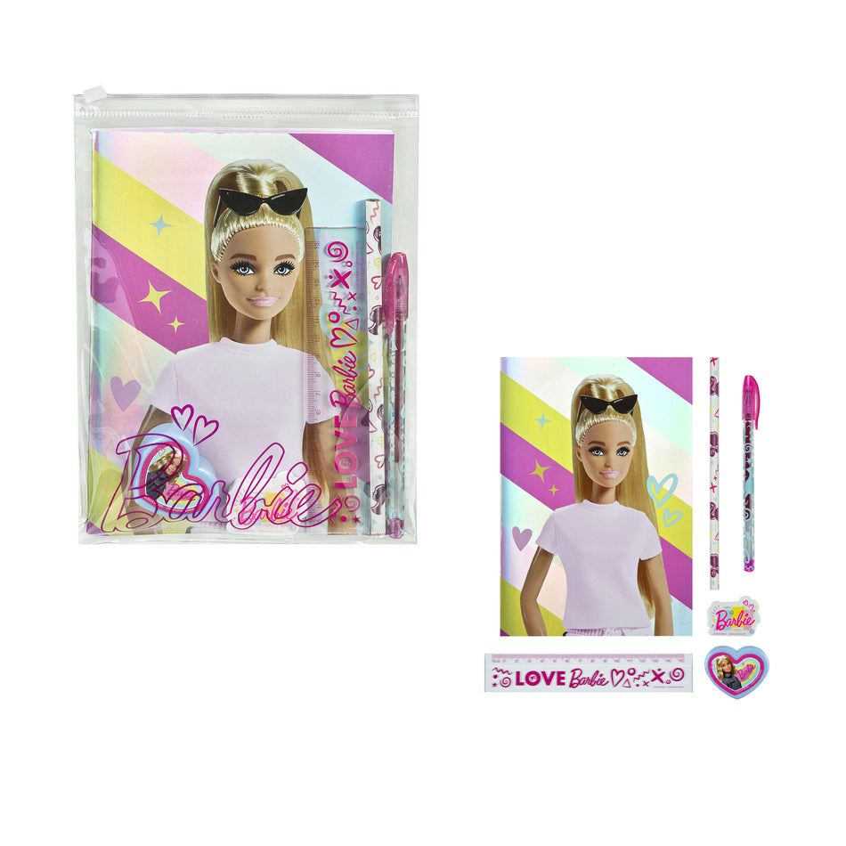 Barbie Note Set 7os. sis. 1 lyijykynä, 1 glitter geelikynä, muotoiltu pyyhekumitopper, sydämenmuotoinen teroitin, viivain, pehmeäkantinen muistikirja A5 (40 lehteä, 80 gsm) suljettavassa säilytystaskussa