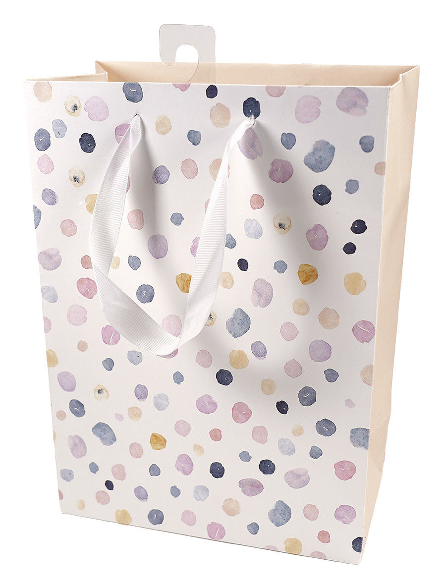Korkealaatuinen Linnis Design lahjakassi pastellisävyisin pilkuin koristeltu ja ribatuilla nauhakahvoilla. L-koko, 23 x 13 x 30 cm. Lue lisää