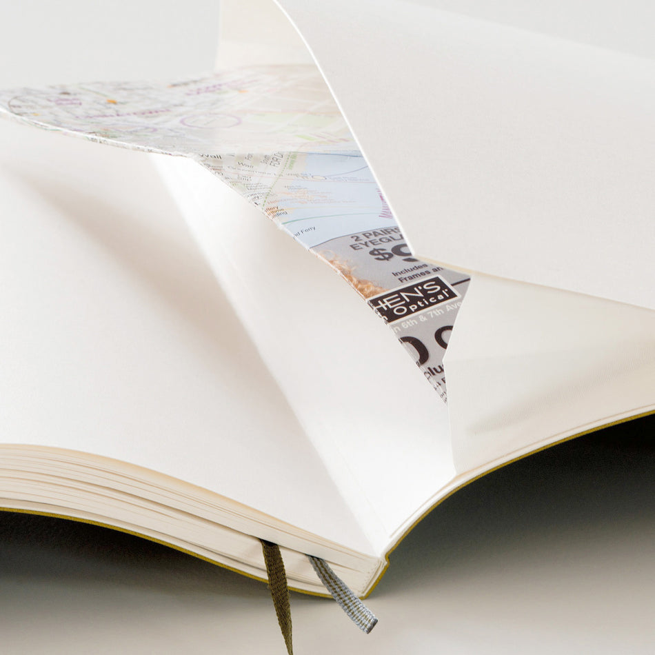 Sidottu, pehmeäkantinen. Taskullinen muistikirja, joka avautuu tasaisesti. 14,5x21cm. 121 numeroitua sivua, 80g. 8 rei'itettyä ja irrotettavaa arkkia. Tyhjä sisällysluettelo. Kirjanmerkki. Joustava kuminauha. Tarroja merkintöihin sekä arkistointiin. Lue lisää