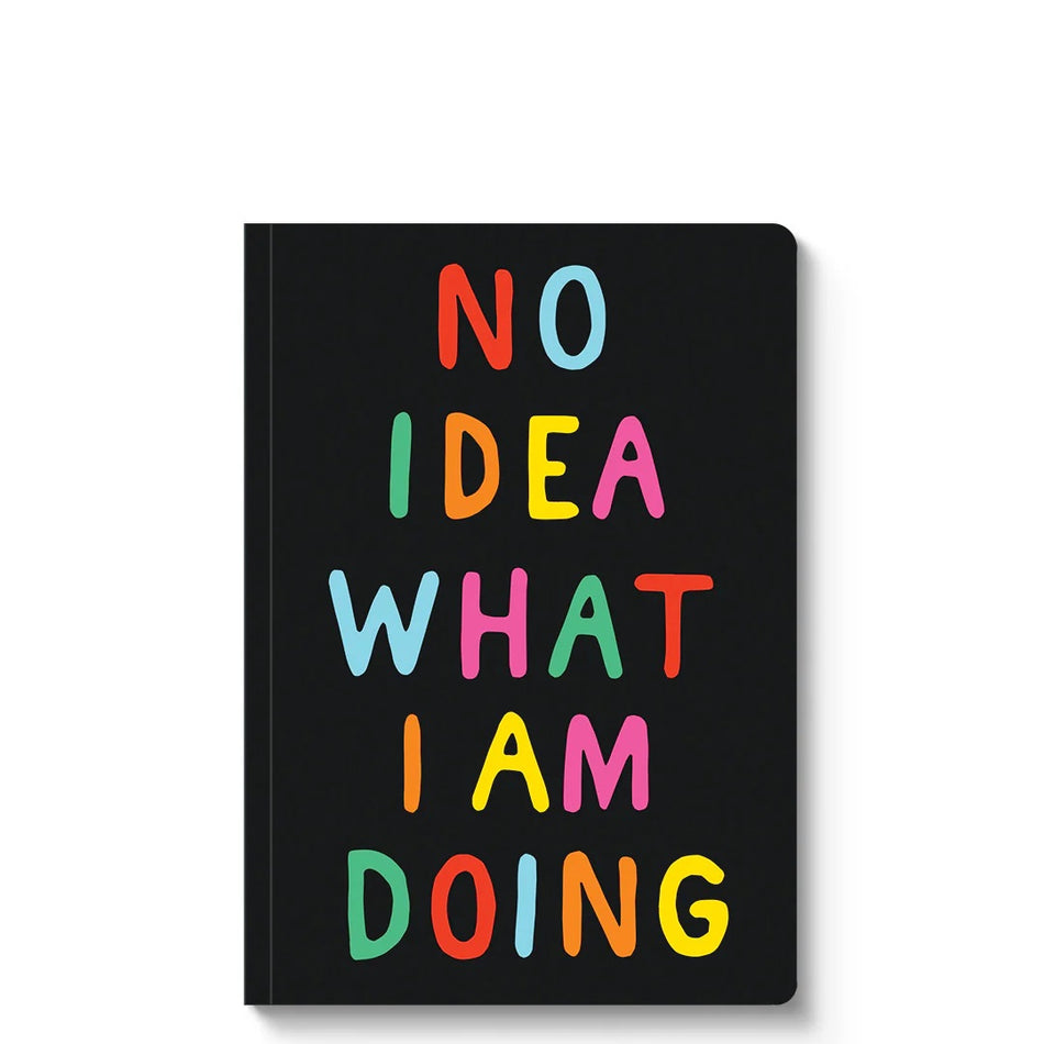 Pehmeäkantinen Ohh Deer -muistikirja. Musta kansi värikkäällä tekstillä "No Idea What I'm Doing". 176 viivoitettua sivua, pyöristetyt kulmat. Koko A5. Design: Badger & Burke. Lue lisää