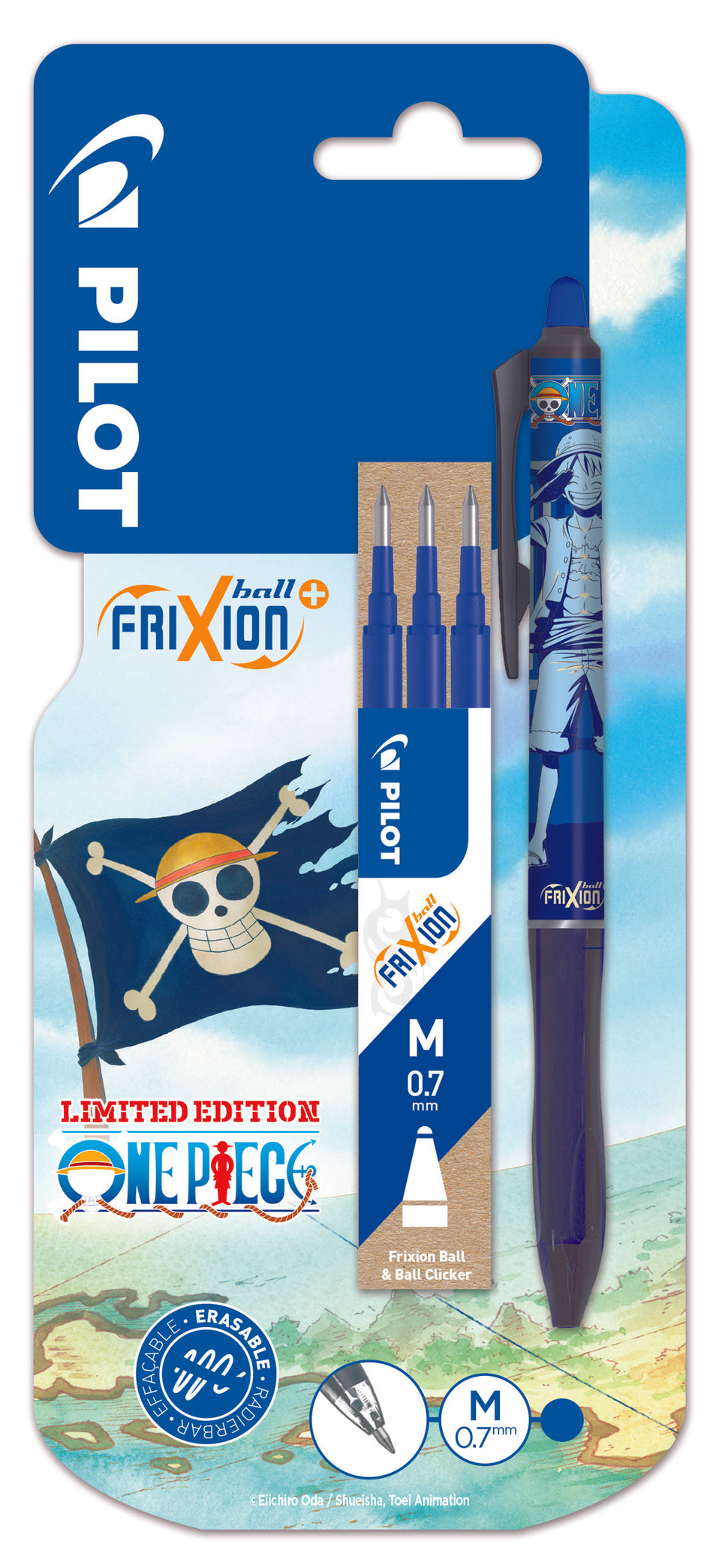 82 % kierrätysmuovista valmistetussa Pilotin FriXion Ball Plus -kuulakärkikynissä seikkailevat suursuosion saaneen japanilaisen manga- ja animesarja One Piecen tähdet. Innovatiivisen FriXion-musteen voi pyyhkiä kirjoittamisen jälkeen pois kynän päässä olevalla pyyhekumilla. Lue lisää