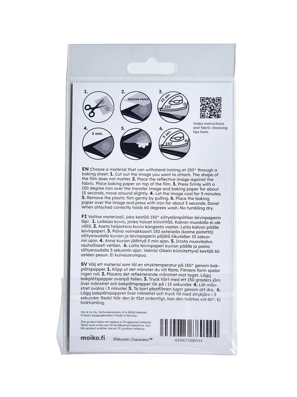Heijastavan silityskuvan kiinnitys on helppoa! Tarvitset vain silitysraudan ja leivinpaperia. Muista aina testata materiaalin sopivuus! Ohjeet silityskuvan kiinnitykseen löytyvät sekä paketin takaa, että Moikon DIY-sivulta. Sivuilta löydät lisäksi inspiraatiota tuunaukseen!