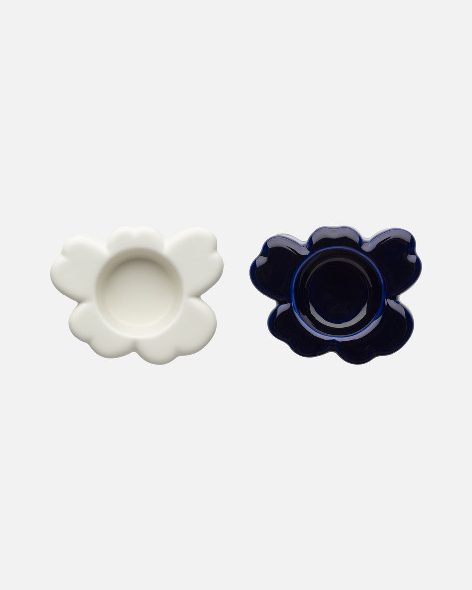 Setissä on kaksi Unikko-kukan mallista kynttilälyhtyä, jotka on valmistettu lasista. Valkoisessa kynttilälyhdyssä on mattaviimeistely ja koboltinsinisessä on kirkas viimeistely. Suosittelemme tuotteille käsinpesua.