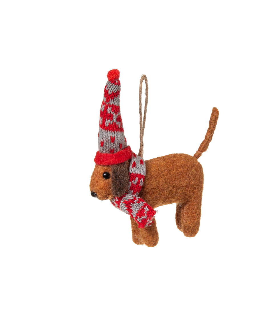 Suloinen ripustettava koirakoriste tonttuhatulla, huopaa, väri ruskea/punainen. Koko 9x3,5x11cm Lue lisää