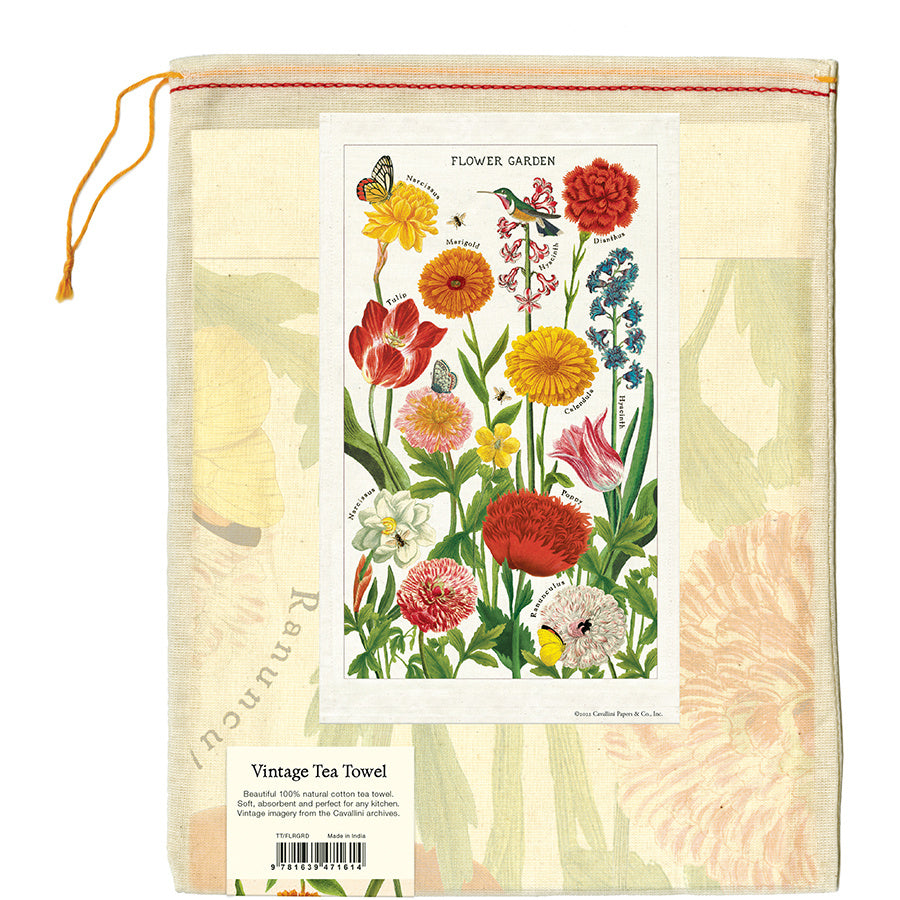 Keittiöpyyhe Flower Garden. 100% puuvillaa, ripustuslenkki. Pakattu kangaspussiin. Koko 48x80cm. Design: Cavallini. Lue lisää
