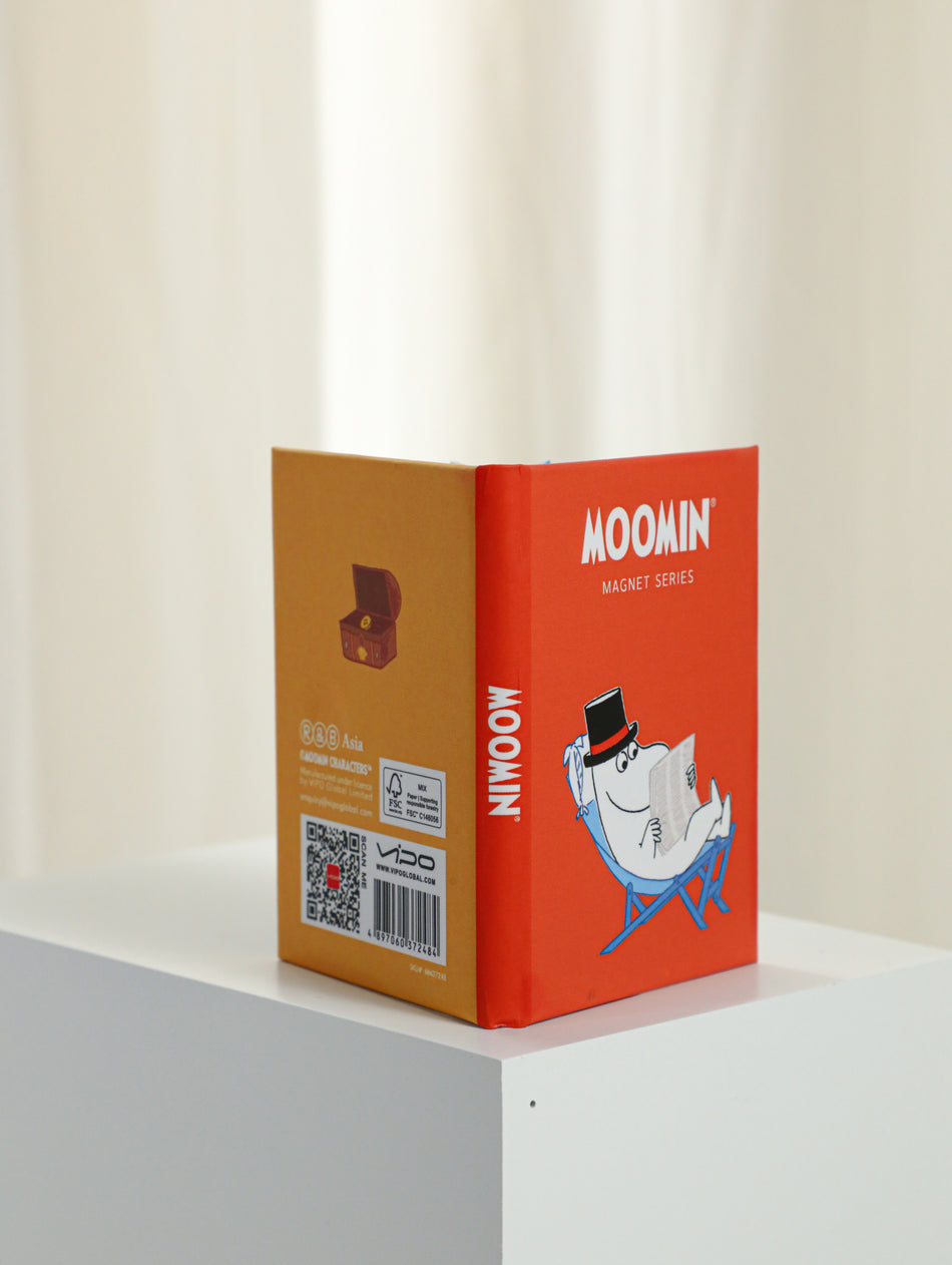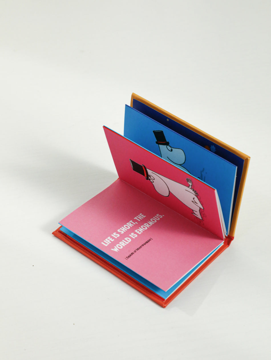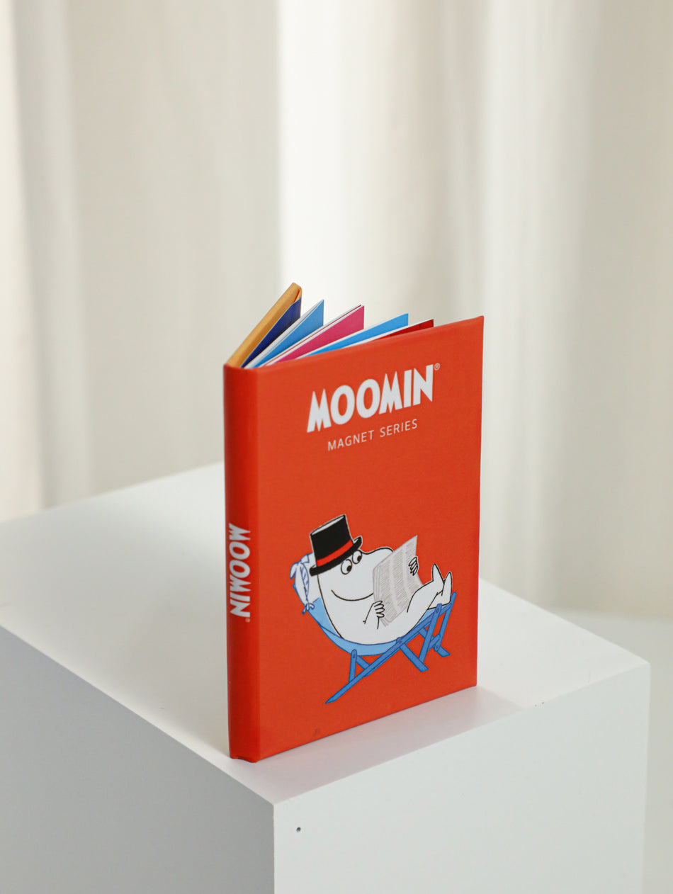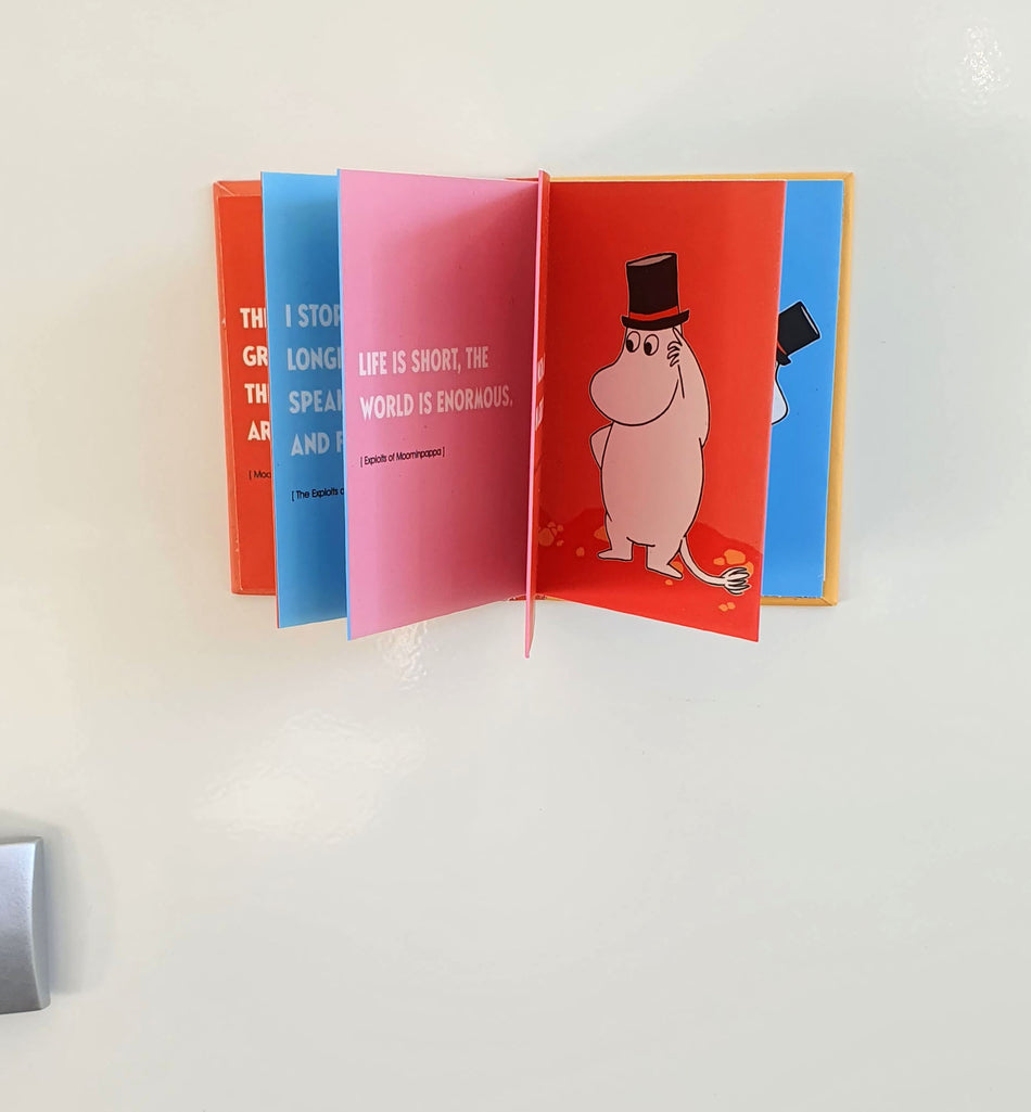 Kirjamagneetti, jossa klassisia fraaseja Muumi-tarinoista. Kirjassa jokaisella aukeamalla on yksi fraasi ja yksi kuva. Magneetit etu- ja takakannessa Lue lisää
