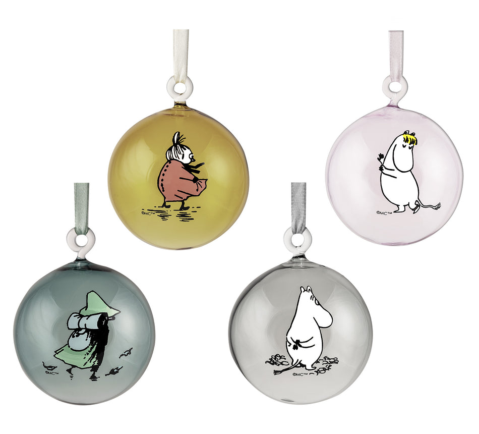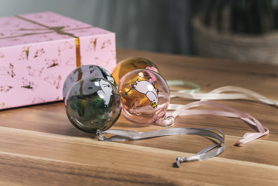 Lahjapakkaus sisältää neljä rakastetuilla Muumihahmoilla kuvitettua koristepalloa, jotka on valmistettu kestävästä borosilikaattilasista. Sisältää satiininauhat ripustukseen. Halkaisija 7 cm. Suunniteltu Suomessa. Lue lisää