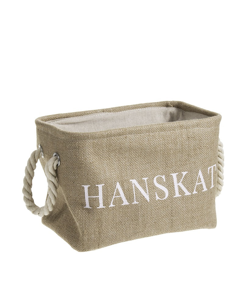 Käytännöllinen juuttikori narupunoskahvoilla. Koko 20x30x20cm, painettu teksti Hanskat Lue lisää