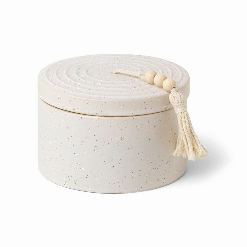 Paddywax -Tuoksukynttilä Sypressi & Kuusi (Cypress &Fir). Valkoinen keraaminen kynttilä kannella. Kannessa helmillä varustettu ripustulenkki. Paino 283g.