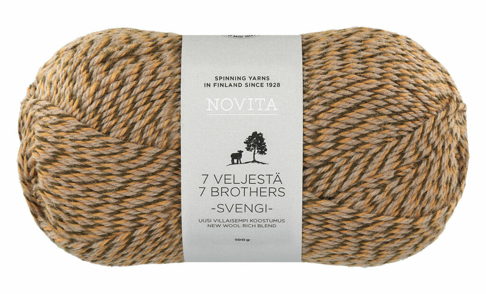 Novita 7 Veljestä Svengi on tasaisesti kirjava neulelanka. Puikkosuositus 4, sukkiin 3.5. Yksi kerä riittää perussukkiin koossa 38. Konepesu 40 asteessa. 100 g:n kerässä 200 m. Avainlipputuote. Lue lisää