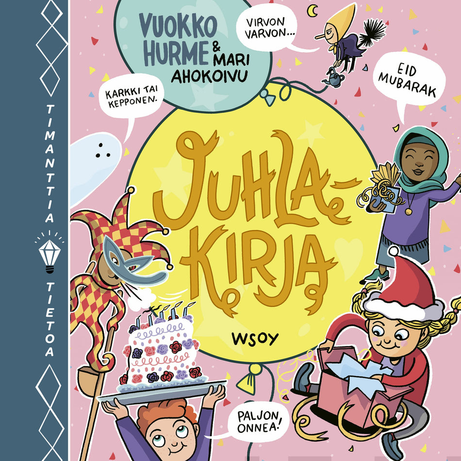 Mari Ahokoivu on tehnyt kirjaan hilpeät kuvat, jotka kutsuvat lukijan mukaan juhlimaan! Vuokko Hurmeen kirjoittamat tietoiskut ovat superhauskaa ja hyödyllistä luettavaa.