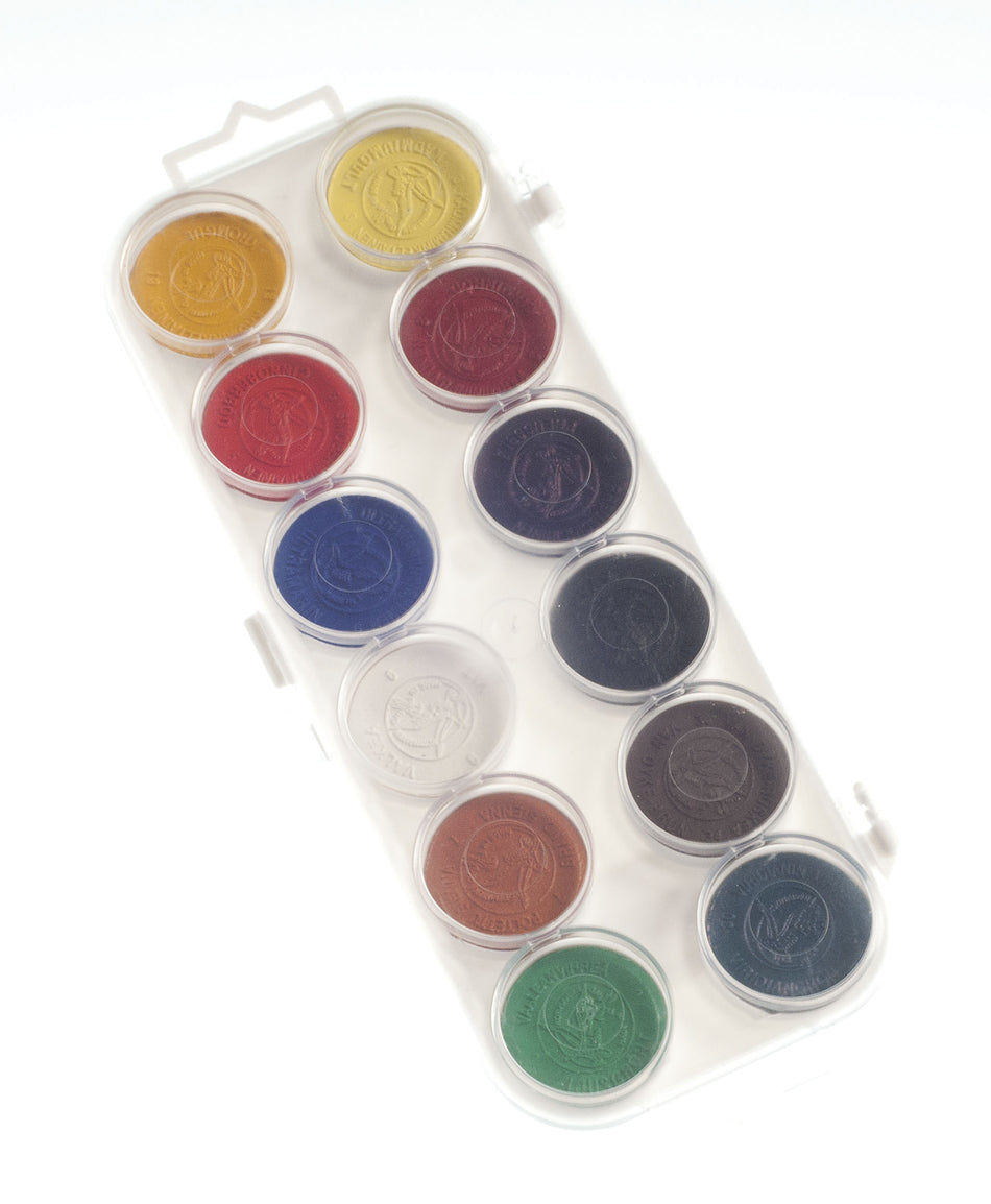 12 värin kovamuovinen paletti sisältää kuusi pääväriä; kaksi keltaista, kaksi punaista ja kaksi sinistä sekä tämän lisäksi valkoisen ja mustan, kaksi ruskeaa ja kaksi vihreää sävyä.