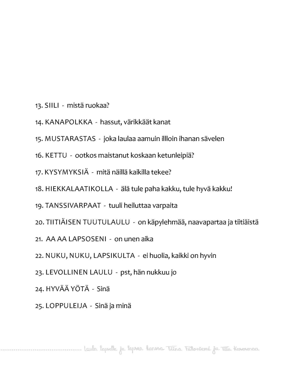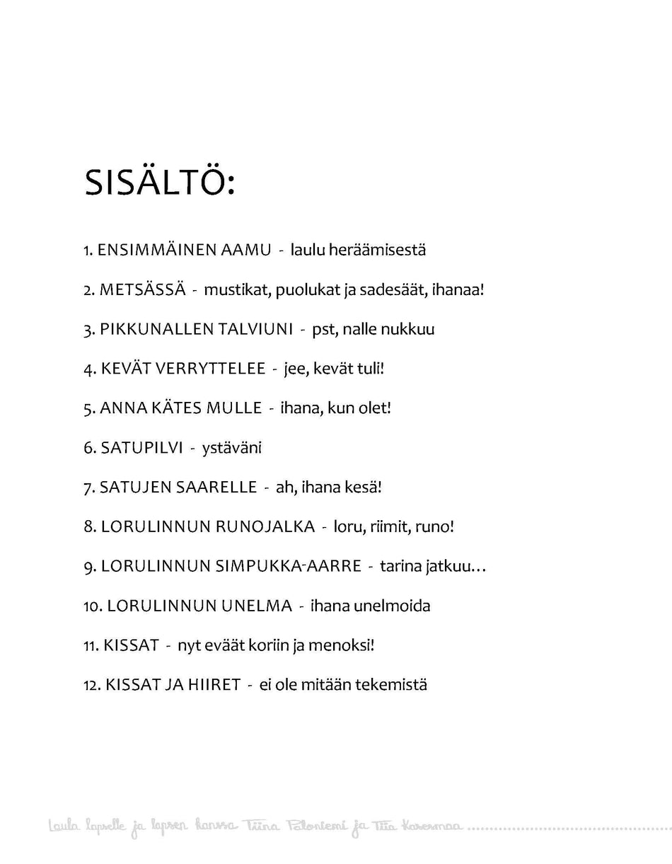 Tämä kirja sai alkunsa ajatuksesta, että aikuinen voi laulaa lapselle ja hänen kanssaan. Ajatus kantaa läpi kirjan. Se kuuluu kirjan nimessä, runojen sävellyksissä ja jo ensimmäisen laulun sanoissa: " Ja tämä aamu on meidän maailma, yhteinen maailma. Me loimme sen." (Jukka Itkonen) Kun sinä laula... Lue lisää