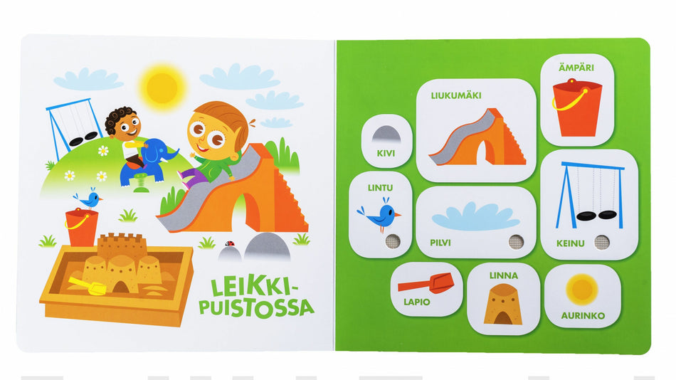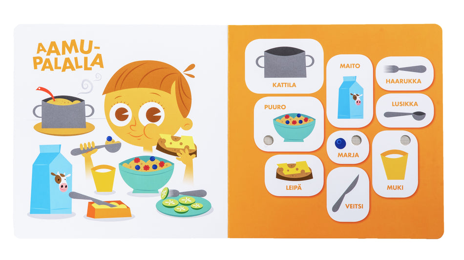 Mitä on tarjolla aamupalalla? Millaisia asioita kuuluu kylpyhetkeen? Iloisesti kuvitettu kirja on täynnä tuttuja asioita ja esineitä. Sanoja voi kuunnella äänipainikkeista ja harjoitella niitä toistamalla. Sanavarasto ja puhe kehittyvät kirjan parissa. Yksityiskohtien etsiminen ilahduttaa pientä ... Lue lisää