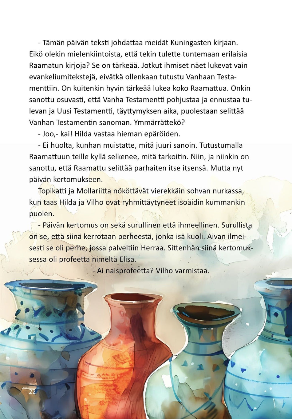 Tämän Vanhan Testamentin teksteihin pohjautuvan kirjan päähenkilöt Hilda, Vilho ja isoäiti kutsuvat sinuakin liittymään seuraansa, kun he käyvät avaamaan Pyhän Raamatun sivuja. Sen sanoista saa niin aikuinen kuin lapsikin ammentaa iloa, rohkeutta, viisautta ja varoituksia jokaiseen elämänsä vaiheeseen.