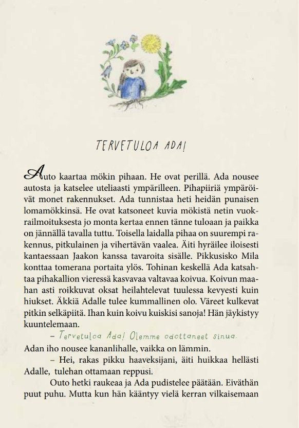 “Adan perhe aikoo viettää kesälomaviikon maalla erään vanhan rouvan vuokramökissä. Heti kun Ada astuu autosta mökin pihalle, hän tajuaa, että jotain outoa on tapahtumassa. Hän kuulee vanhan pihakoivun puhuvan! Kukaan muu ei tunnu huomaavan mitään. Paikkakunnalla eläneellä Adan isoisomummollakin on omat salaisuutensa. Pian paljastuu mysteeri toisensa jälkeen.”