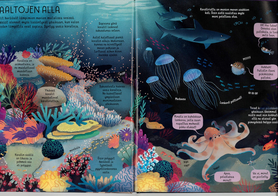 Suurikokoinen, näyttävä kirja vetää pientä lukijaa puoleensa kuin syötti yöperhosta. Upeasti kuvitetuilla aukeamilla riittää tutkittavaa ja kiinnostavia yksityiskohtia.