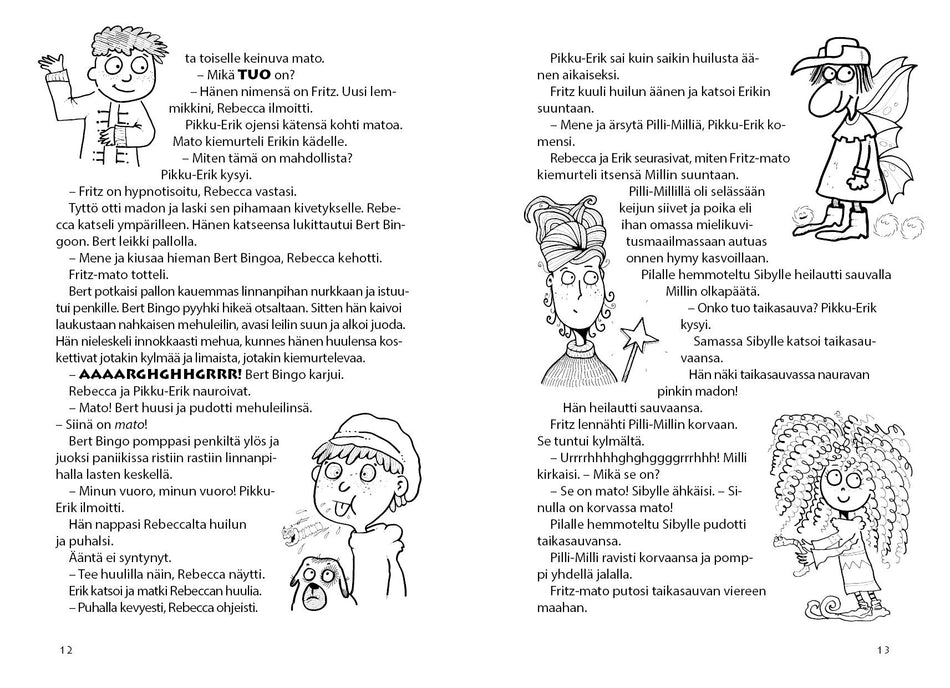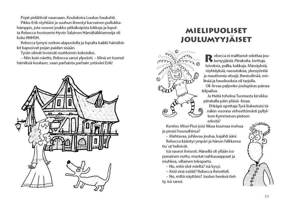 Mitä tahansa Rebecca touhuaakin, syntyy paljon porua ja riemua niin pikkuveljelle, äidille, isälle, opettaja Tyrälle kuin koulukavereille.