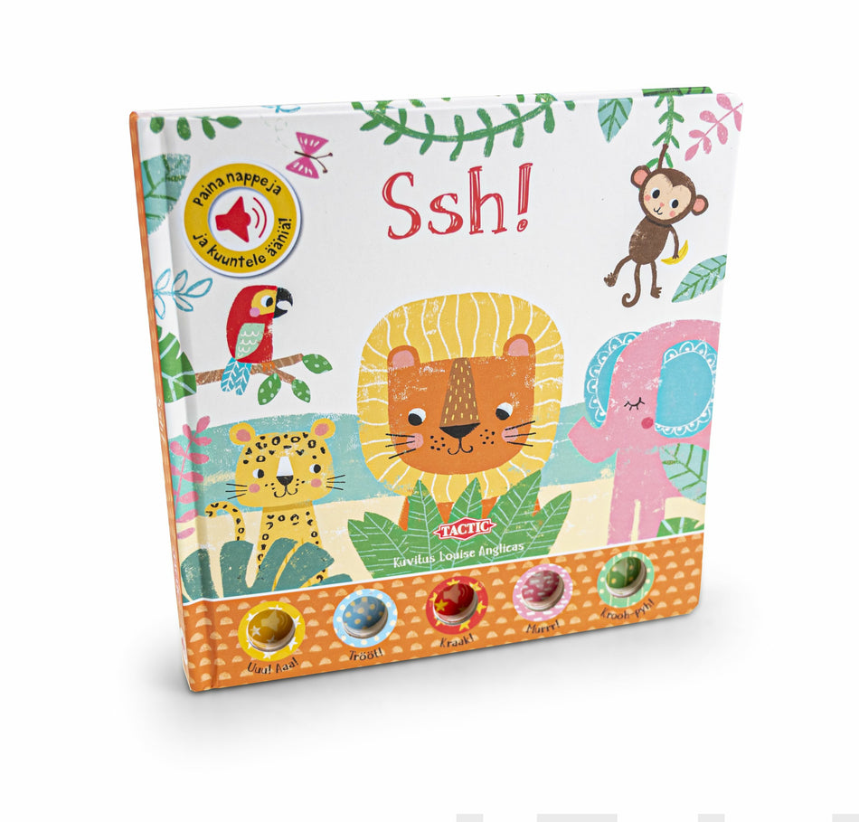 Ihana äänikirja viidellä erilaisella eläimen äänellä. Paina nappeja ja kuuntele! Viidakossa on äänekästä! Shh!