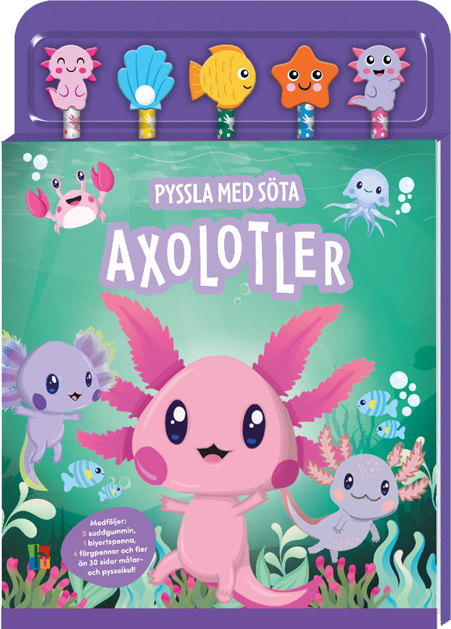 Har du sett en axolotl någon gång?I den här boken får du chansen! Färglägg de söta bilderna och klura ut de roliga pysslen med hjälp av medföljande pennor och suddgummin. Kicka igång fantasin och följ med in i axolotlernas gulliga värld!