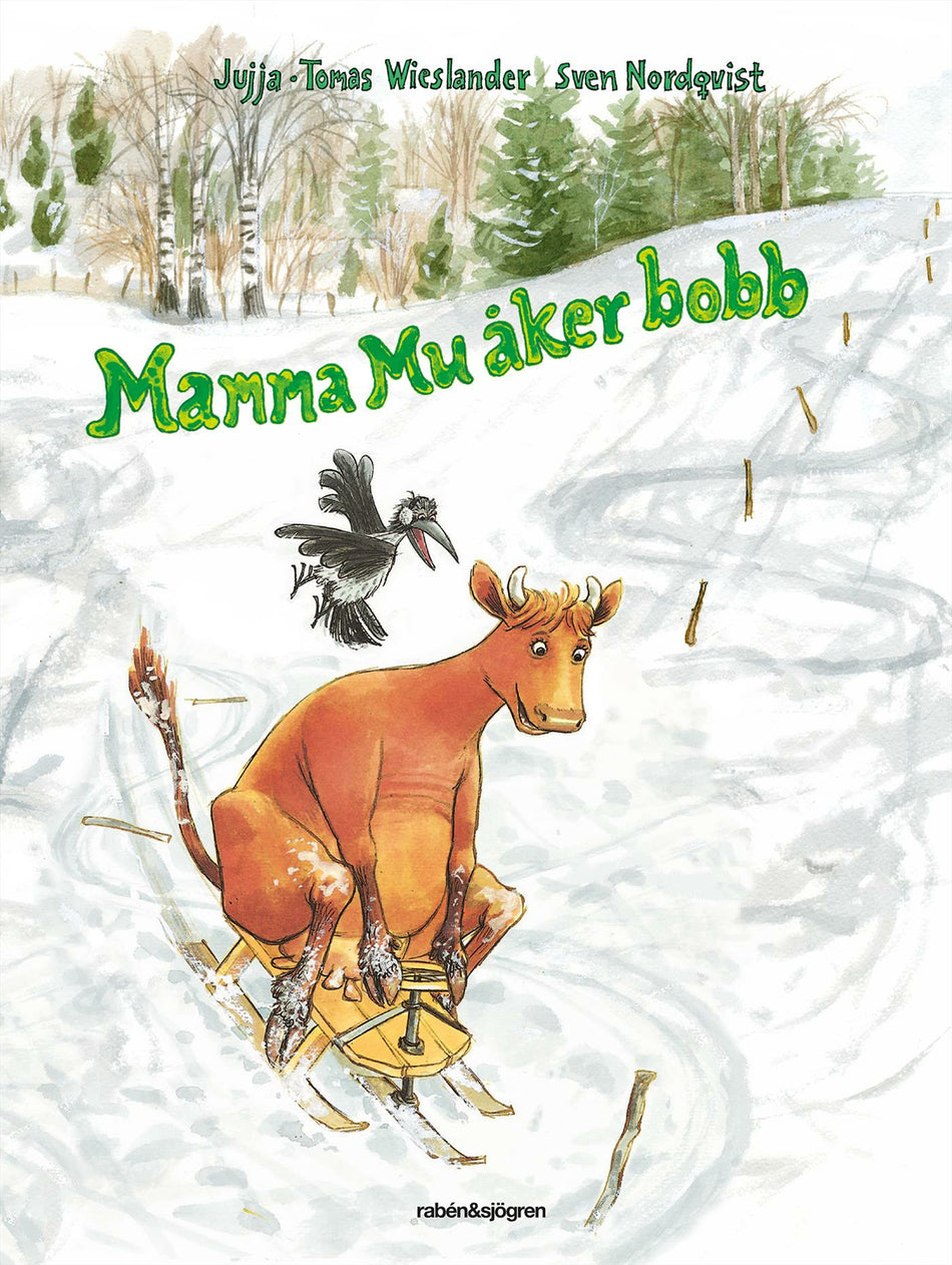 Mamma Mu står och tittar ut genom lagårdsfönstret. I backen utanför åker bondens barn bobb. De svänger och hoppar och dunsar, vilken fart de har! När bobben välter ramlar de av och rullar runt i snön, det är roligast av allt. Oj, vad de skrattar! Mamma Mu vill också åka bobb. Och trilla av! Kråka... Lue lisää