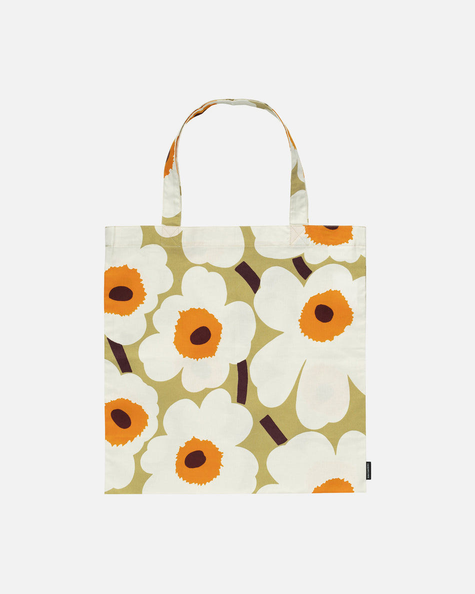 Puuvillasta valmistetussa kassissa on Pieni Unikko -kuosi. Kassi on helppo taitella toisen laukun sisään ja pitää aina mukana. Kangas on painettu Helsingissä.