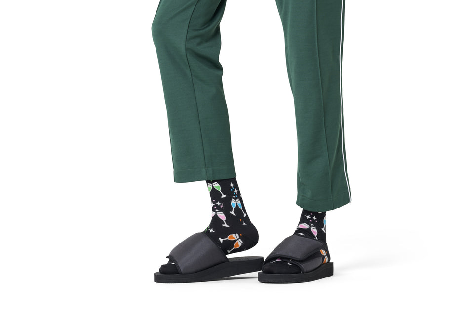 Juhli tyylillä Happy Socks Cheers-sukilla – kuohuviinilaseja tyylikkäällä mustalla pohjalla. Täydellinen lahja tai hauska lisä asuusi! Lue lisää