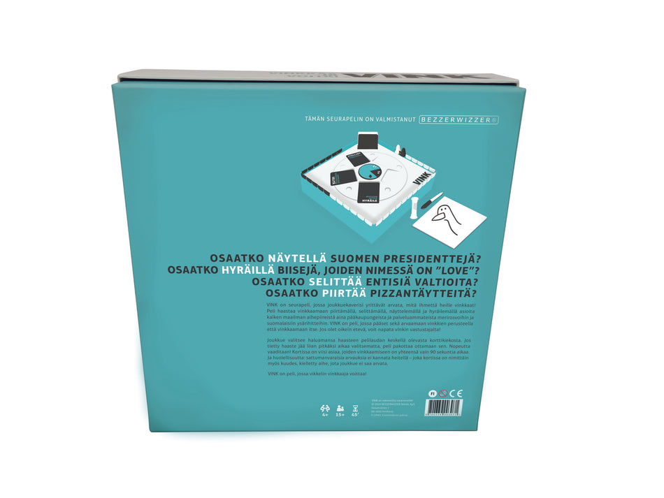 VINK on seurapeli, jossa joukkuekaverisi yrittävät arvata, mitä ihmettä heille vinkkaat! Peli haastaa vinkkaamaan piirtämällä, selittämällä, näyttelemällä ja hyräilemällä asioita kaiken maailman aihepiireistä aina pääkaupungeista ja palveluammateista merirosvoihin ja suomalaisiin ysärihitteihin. VINK on peli, jossa pääset sekä arvaamaan vinkkien perusteella että vinkkaamaan itse. Jos olet oikein etevä, voit napata vinkin vastustajalta! Joukkue valitsee haluamansa haasteen pelilaudan keskellä olevasta korttikiekosta. Jos tietty haaste jää liian pitkäksi aikaa valitsematta, peli pakottaa ottamaan sen. Nopeutta vaaditaan! Kortissa on viisi asiaa, joiden vinkkaamiseen on yhteensä vain 90 sekuntia aikaa. Ja huolellisuutta: sattumanvaraisia arvauksia ei kannata heitellä – joka kortissa on nimittäin myös kuudes, kielletty aihe, jota joukkue ei saa arvata. VINK on peli, jossa vikkelin vinkkaaja voittaa!