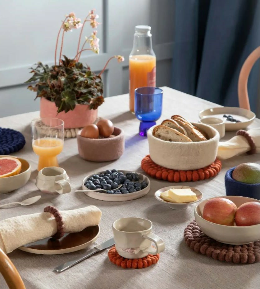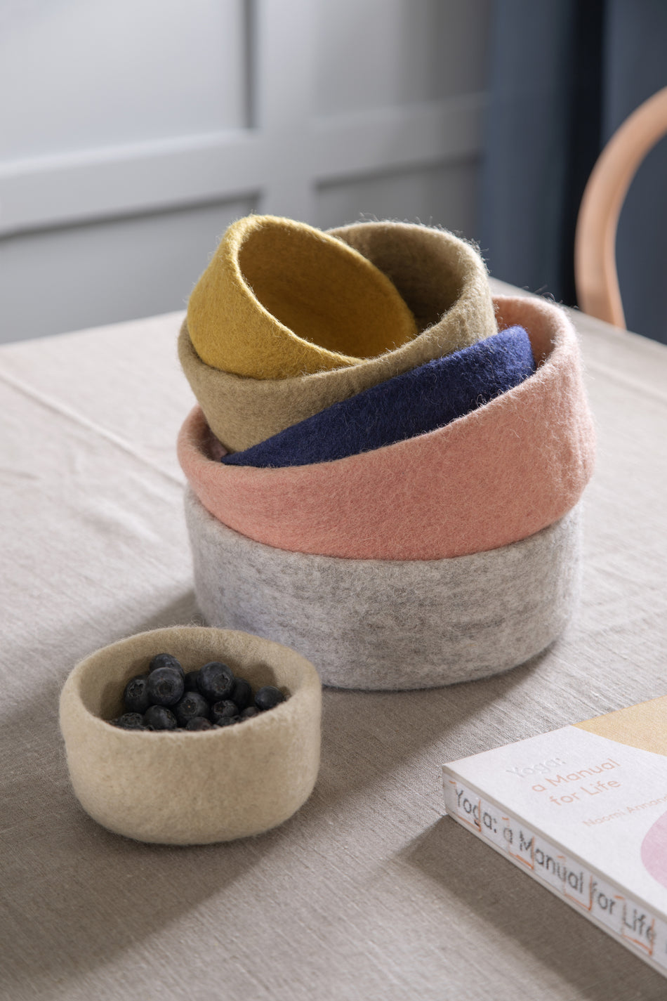 Huopakoriste kulhosetti laventeli Gry & Sif sisältää kolme pehmeää säilytysastiaa erilaisille pikkuesineille. Korkeudeltaan ne ovat 8 cm ja halkaisijaltaan 12 cm, 17 cm ja 23 cm. Nämä kauniit kulhot ovat täydellisiä pöytäkattauksessa sekä säilyttämään koruja, avaimia tai muita pieniä esineitä ja samalla tuovat ripauksen tyyliä ja lämpöä kotiisi. Sijoita ne keittiöön, makuuhuoneeseen, eteiseen tai olohuoneeseen järjestyksen luomiseksi ja sisustuksen kohentamiseksi.