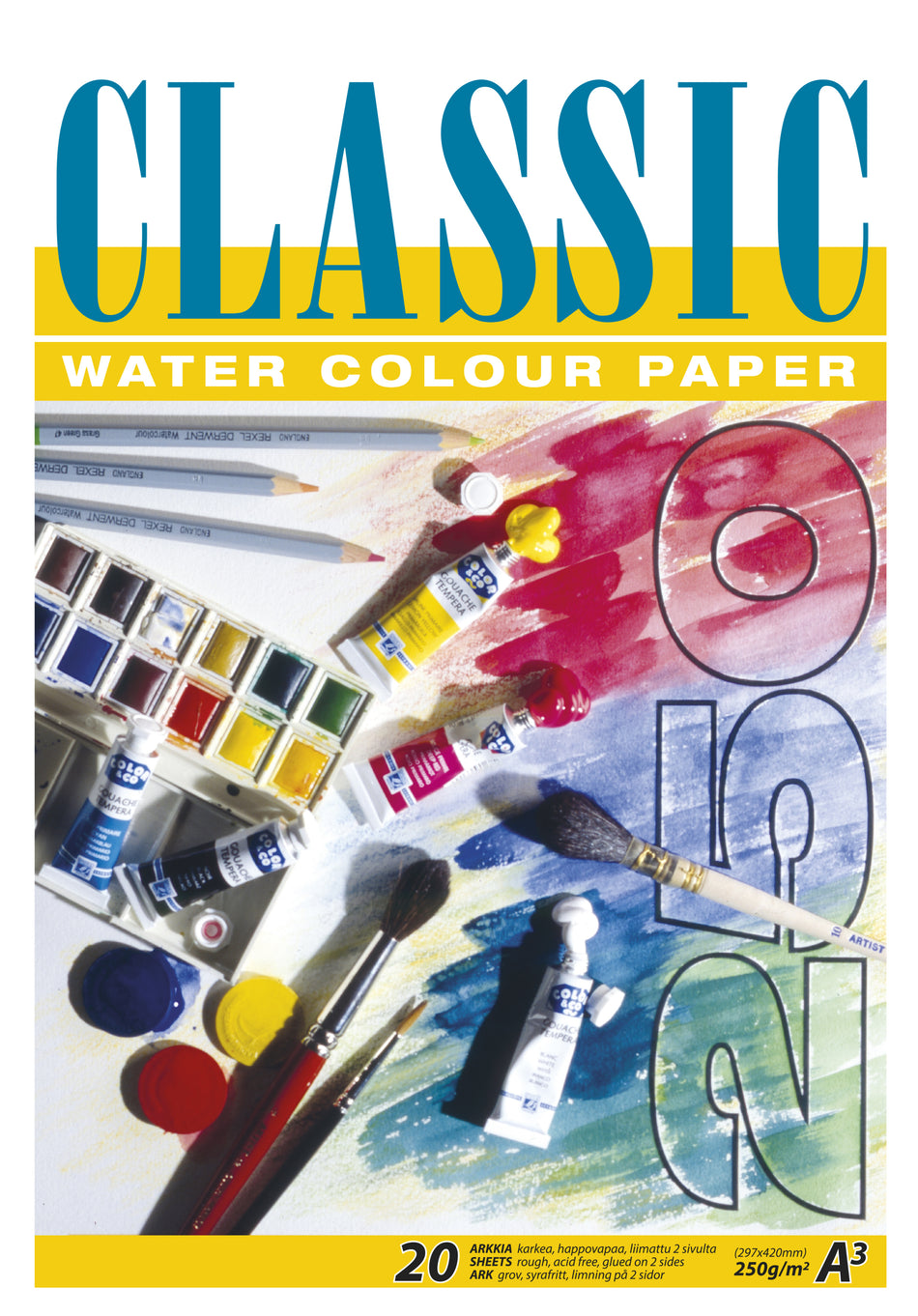 Classic- akvarellilehtiö sisältää 20 arkkia luonnonvalkoista, happovapaata paperia. Paperi on liimattu kahdelta sivulta. Lehtiön koko: A3, Arkkeja: 20, Vahvuus: 250 g/m², Väri: luonnonvalkoinen Lue lisää