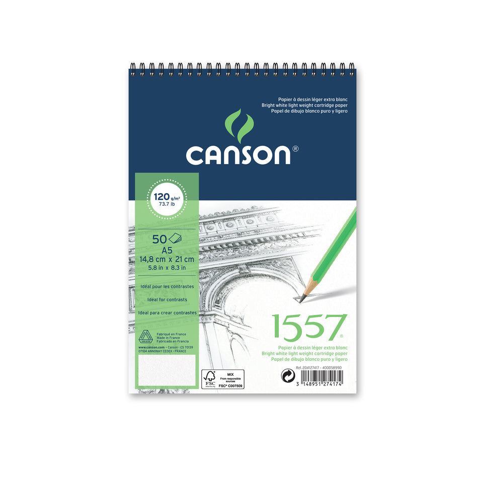Canson 1557-luonnoslehtiössä on 50 arkkia erittäin valkoista happovapaata 120g luonnospaperia koossa A5. 100%:sta selluloosaa. Kierre lyhyellä selällä.