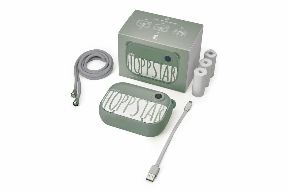 - Paketti sisältää: Hoppstar Artist -kamera, 16GB SD-kortti, kantokaulanauha, USB-latauskaapelin, 1x OTG-sovittimen Micro USB, 1x OTG-sovittimen tyyppi C, 3 ylimääräistä paperirullaa, manuaalinen