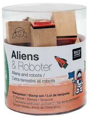 Leimasinsetti, jossa 15 kpl leimasimia. Leimojen aiheena Alienit ja Robotit. Leimasimessa musta muste. Leiman koko 2x2 cm. Lue lisää