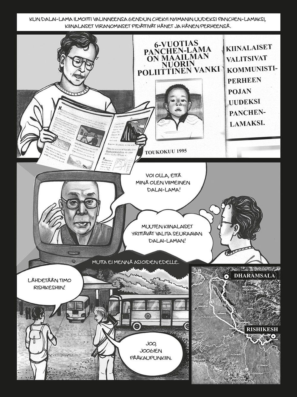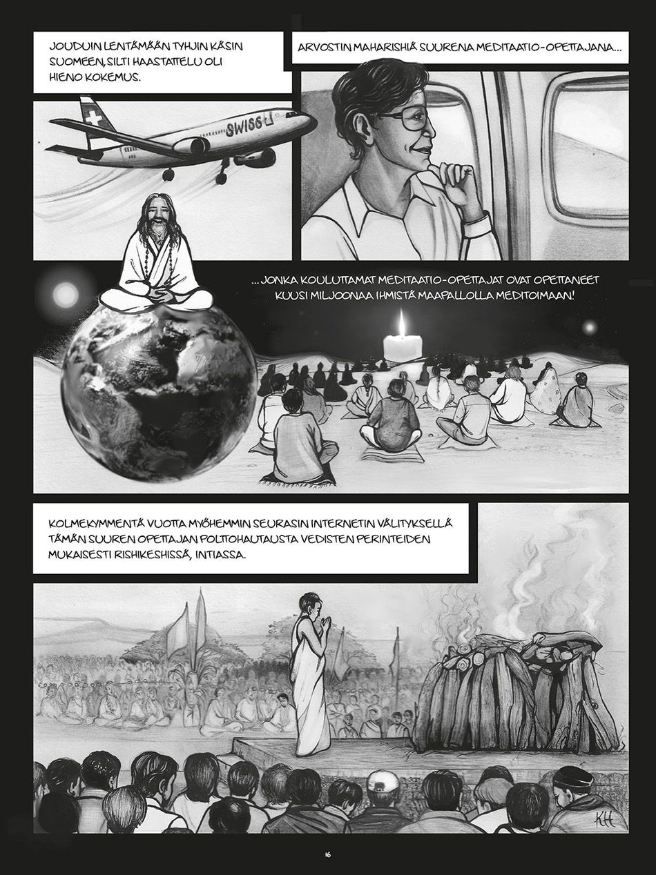 Taavi Kassilan matka henkisten opettajien maailmassa jatkuu. Sarjakuvatrilogian toisessa osassa hän matkustaa Sveitsin Alpeille haastattelemaan Beatles-yhtyeen guruna maailmanmaineeseen noussutta Maharishi Mahesh Yogia sekä Himalajan vuoristoon, missä Taavi saa haastatella Hänen Pyhyyttään Dalai-... Lue lisää