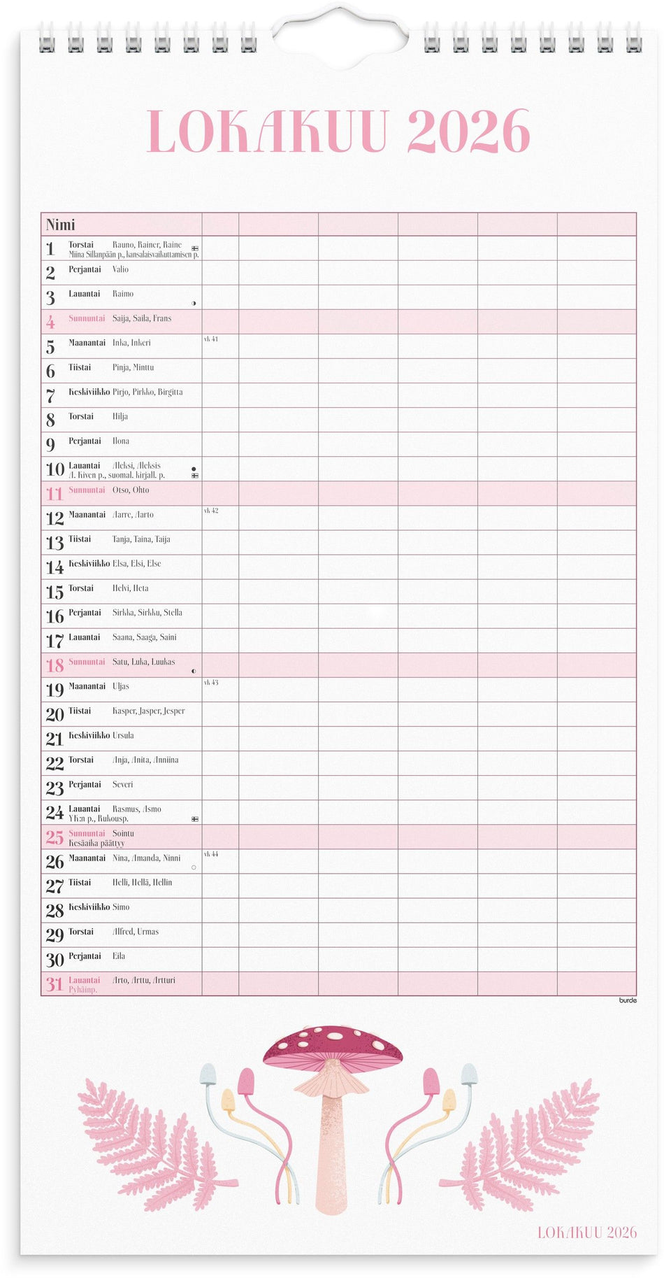 Annien perhekalenteri antaa selkeän yleiskuvan siitä, mitä tapahtuu minäkin päivänä. Jokaisen kuukauden aukeamalla, löytyy suloisia kuvituksia suunnittelija Annie Hjälmefjordilta. Viiden sarakkeen ja kuudennen pienemmän sarakkeen ansiosta koko perheelle löytyy tilaa kirjata harrastukset, juhlat j... Lue lisää