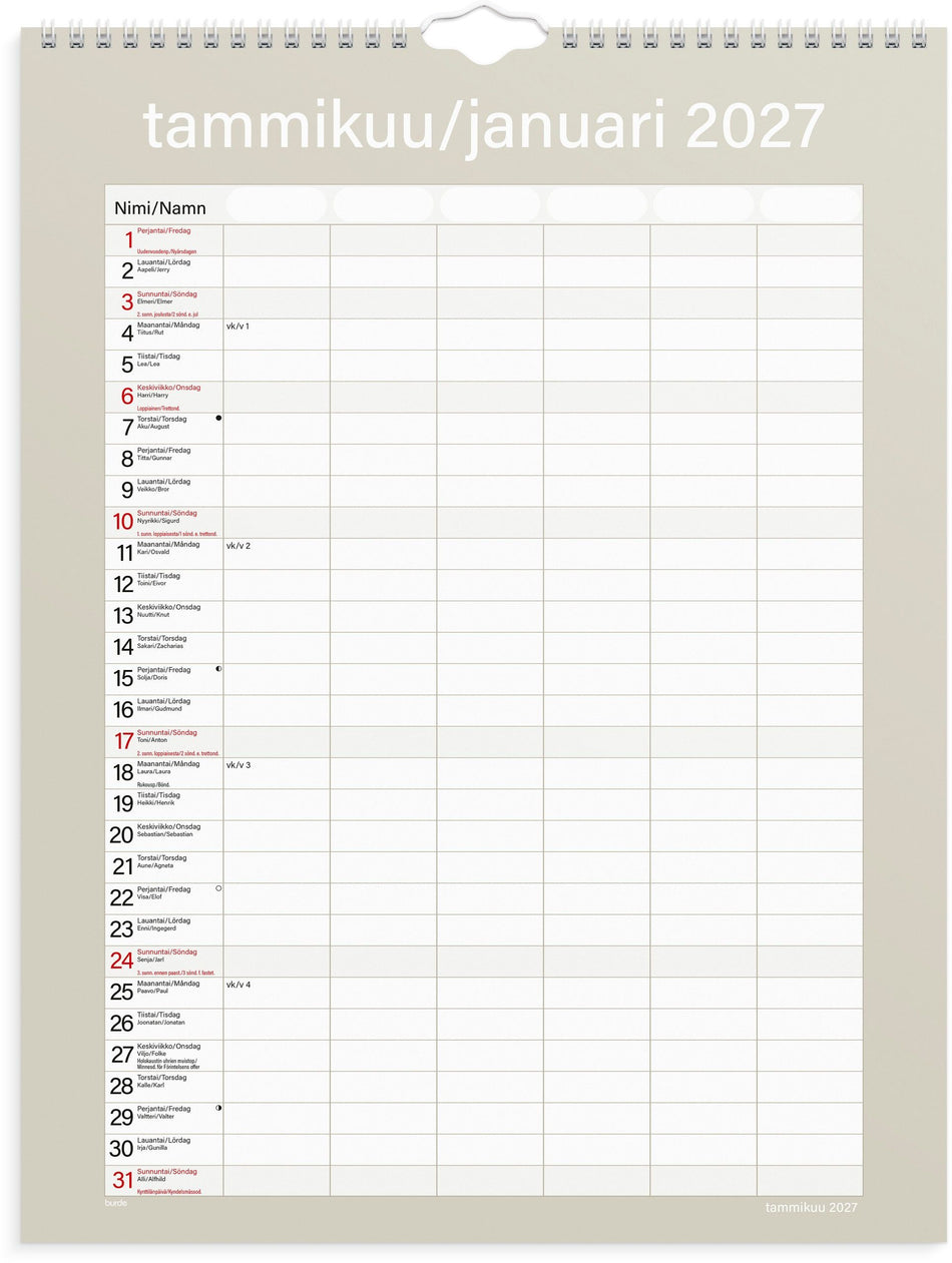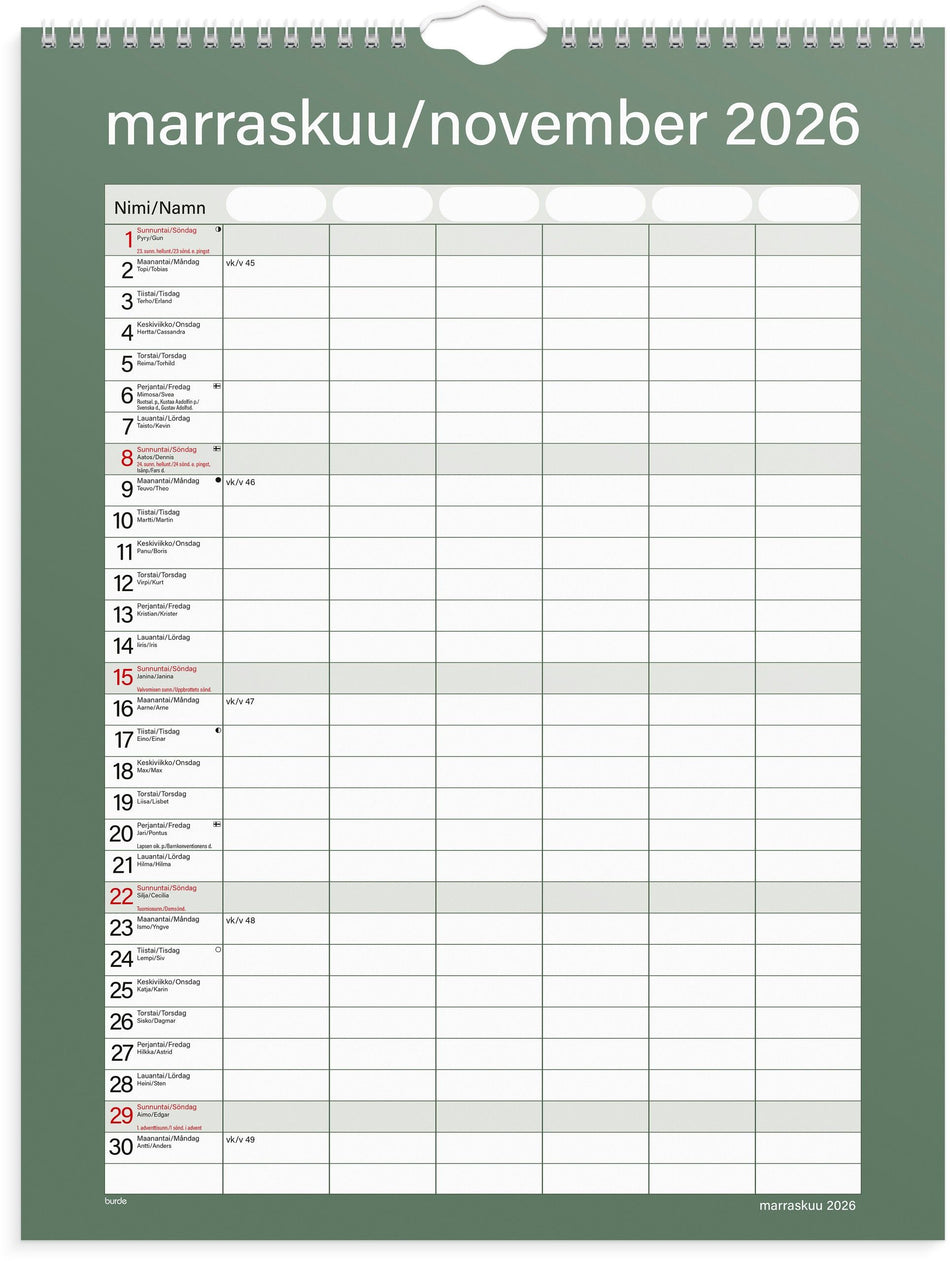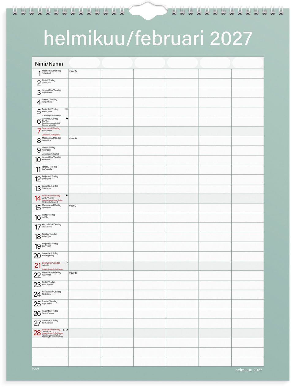 Yksinkertainen perhekalenteri kuudella sarakkeella. Kalenteri sisältää nimipäivät, liputuspäivät, kansalliset pyhäpäivät ja kuun vaiheet. Kalenteriosa: heinäkuu 2026 - kesäkuu 2027. Kaksikielinen: suomi/ruotsi. Parikierresidottu. FSC®. Lue lisää