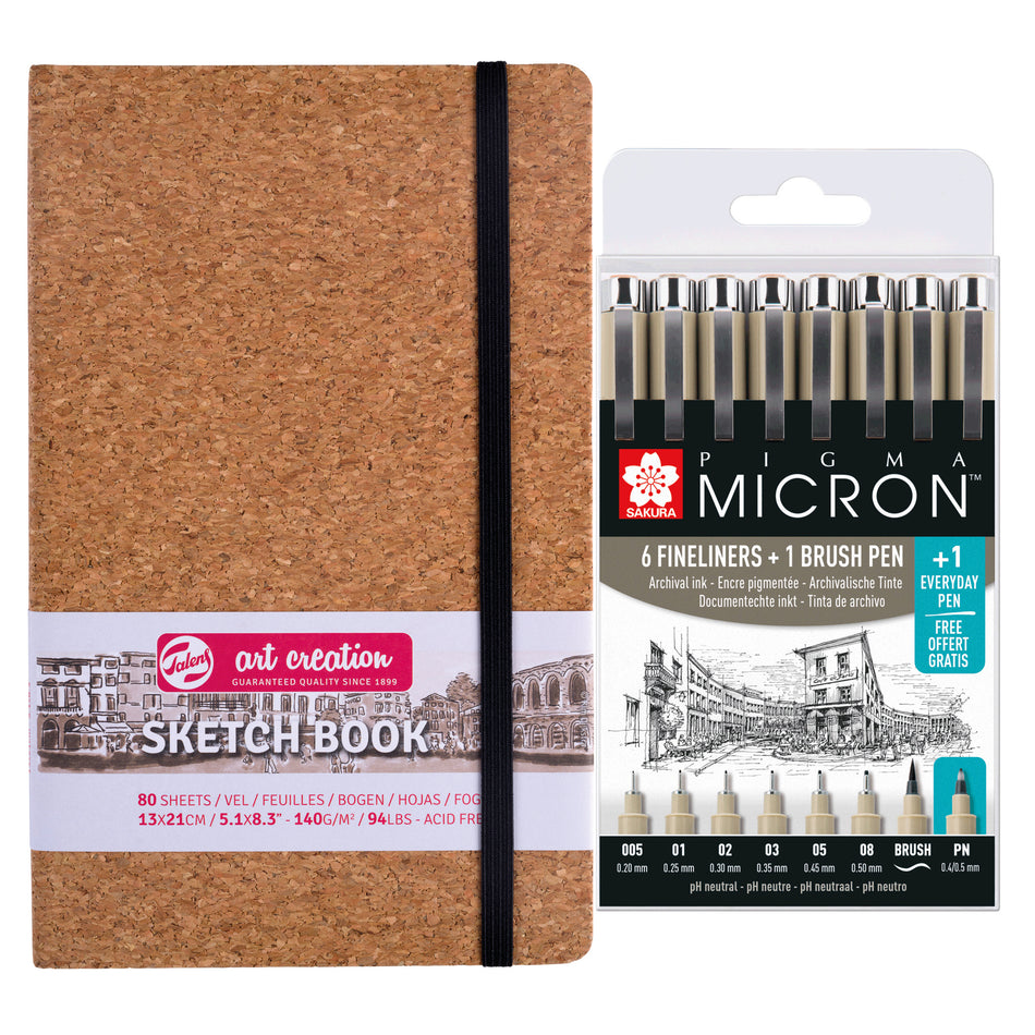 Luonnoskirja korkkikantinen ja 8 kpl Pigma Micron kuitukärkikynää