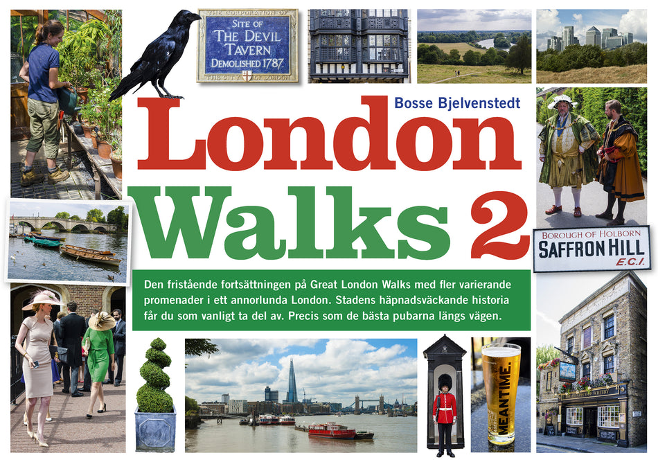 Vi följer ännu en ny underjordisk flod och får se mer av Themsens omgivningar både uppströms och nedströms. London City i eldens spår vid den stora branden 1666 och lagens boningar runt Fleet Street. Det blir lantliga trädgårdar, moderna bankpalats bland forna skeppsdockor, besök på piratpubar och kungliga slott. Variationen är om möjligt ändå större än i den första boken. Förutom författarens egna kartor och tydliga vägbeskrivningar finns här också goda råd om hur du kan vara utrustad på promenaderna och hur du lättast tar dig runt i miljonstaden. Oavsett om du väljer en kortare eller längre promenader får du en unik upplevelse. Mat och dryck finns det i regel utmed vägen på pubar, restauranger och caféer. Vilka du ska välja får du veta i boken. Det behändiga format gör att boken är lätt att ta med sig på promenaden, samtidigt som alla bilderna gör den till en trevlig upplevelse redan hemma i favoritfåtöljen. London Walks 2 är en bok man kan läsa även om man inte har en Londonresa inplanerad. Den är en upplevelse i sig och inte bara en förberedelse inför kommande sådana.