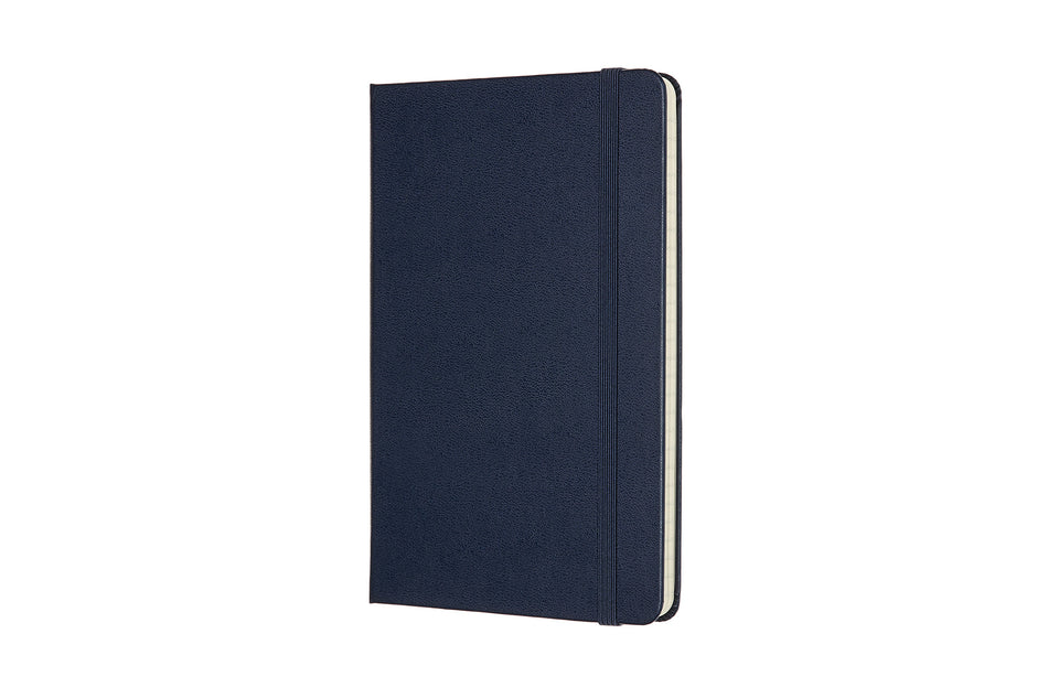 This Moleskine Hardcover Medium Ruled Sapphire Blue Notebook has rounded corners and an elastic closure. Featuring 208 ivory-coloured acid-free 70gsm pages, thread bound, and an expandable inner pocket made of cardboard and cloth. Includes a ribbon bookmark, an 'in case of loss' notice, and a removable leaflet with the history of Moleskine.
