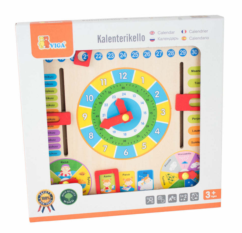 Puinen kalenterikello on täydellinen työkalu kellonaikojen oppimiseen. Sen avulla lapsi voi myös opetella viikonpäiviä, päivämääriä, kuukausia, vuodenaikoja ja säätiloja. Kalenterikello voidaan kiinnittää seinään ja sen koko on 30x2,5x30 cm. Paketin koko on 31x3,5x31 cm. Tämä kalenterikello sopii lapsille, jotka ovat vähintään 3-vuotiaita. Se on sekä opettavainen että hauska tapa oppia aikaa ja päiviä!